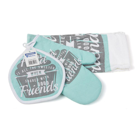 Set bucatarie format din 3 piese- Briosa Azur Setul contine : 1 prosop de bucatarie 38X63CM65Gr/buc 1 manusa de bucatarie 17X27CM 1 suport oala 18X18CM Material 100% Bumbac